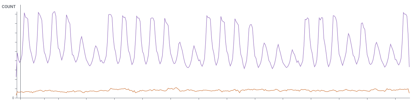 Figure 4: Malicious bot traffic (in orange) uses fake diurnal patterns to look very similar to genuine traffic.