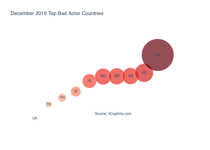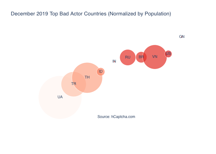 Here we see that Ukraine, Thailand, Vietnam, Turkey, and Russia are generating far more bad actor traffic proportional to their population than large countries like the US, China, and India.