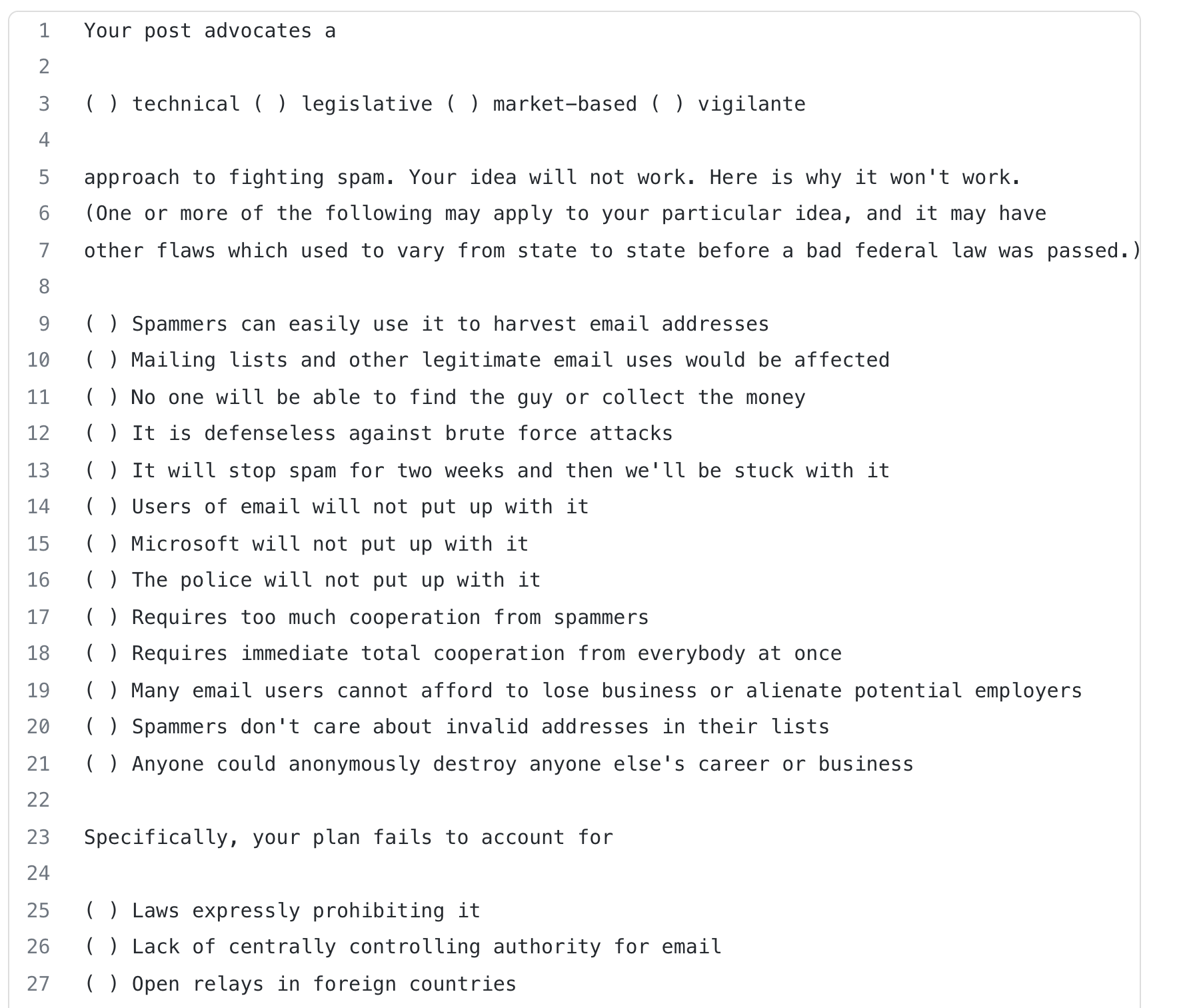 The first known spam email was sent in 1978. [1] Almost five decades later, email spam continues to plague us. Many billions of dollars and thousands of person-years of engineering effort have been put into defeating it, and yet spam persists. There are billion dollar industries on both sides, i.e. those defending against it and those sending it.